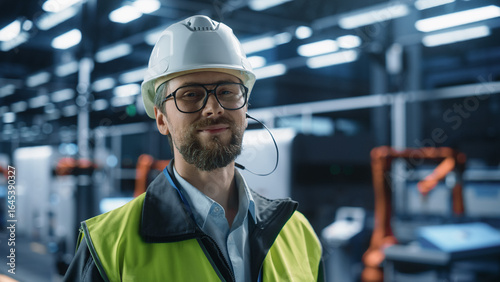Portrait of Adult Caucasian Male Production Supervisor Wearing Glasses and Looking at Camera, Smiling. Technician in Hardhat And Reflective Jacket at Industrial Factory with Robotic Arms Assembly Line