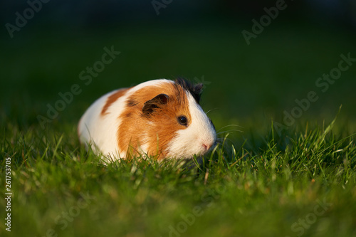 Portrait of adult pocket pet, domesticated and tricoloured Guinea pig also known as cavy, domestic cavy or cavia grazing a grass during spring sunset. Species of rodent belonging to family Caviidae