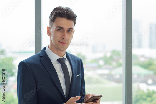 Portrait of adult smart business man in suit outfit standing and using smartphone in modern workplace