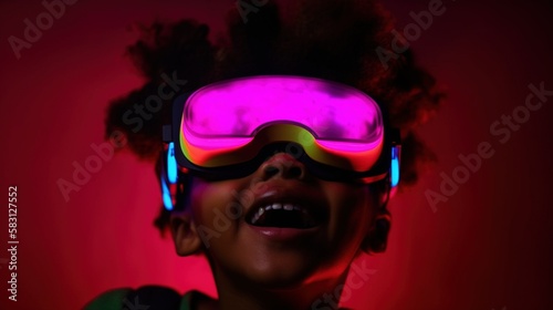 Portrait of African-American child wearing virtual reality headset. Vivid colors neon glowing HMD on girls`s face generative ai