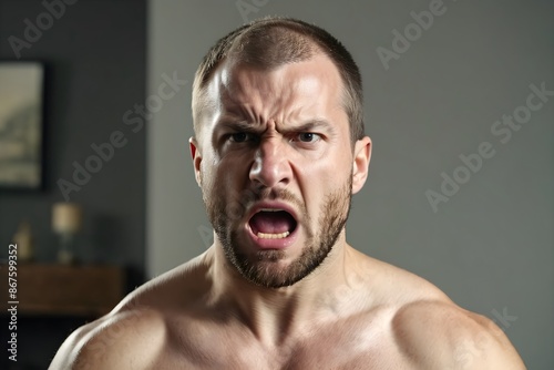 Portrait of an angry muscular man with a furious expression, shouting in pain and frustration on a gray background