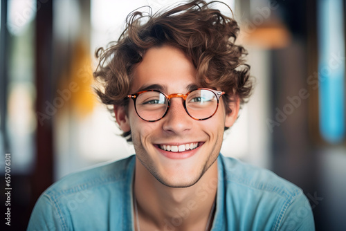 Portrait of an attractive young man wearing eyeglasses. Head shot of smiling person wearing glasses.