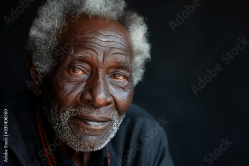 Portrait of an elderly black man with grey hair at blank black background with copyspace for ads