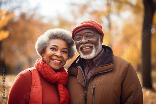 Portrait of an elderly couple together. Happy senior african american couple in autumn park.
