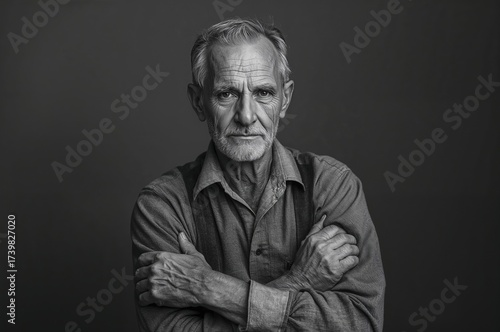 Portrait of an elderly male with crossed arms captured in black and white, showcasing rugged features and hands that reflect a lifetime of hard work as a farmer.
