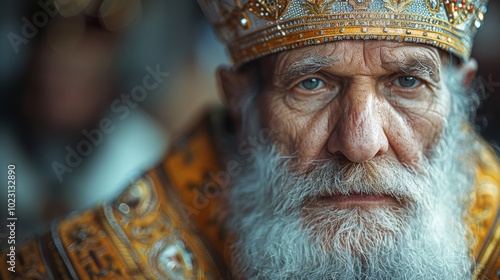 Portrait of an elderly man adorned in elaborate, traditional religious attire, capturing the intricate details of his ornate headpiece and rich fabric robe