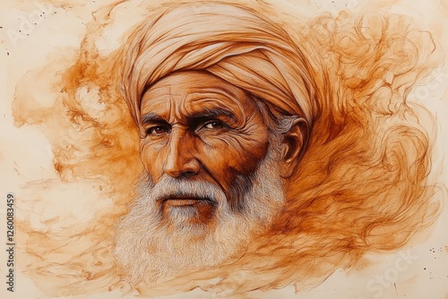 Portrait of an elderly man with a turban and gray beard in earthy tones