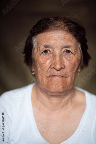 Portrait of an elderly woman in the studio close-up on a dark background.