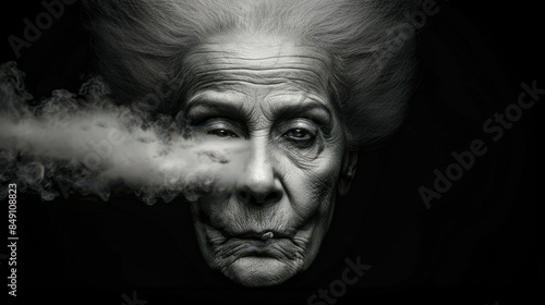 Portrait of an Elderly Woman Smoking a Cigarette: Capturing the Deep Wrinkles, Intense Eyes, and Winter Clothing in a Striking Image that Conveys a Lifetime of Stories Wallpaper Digital Art Poster
