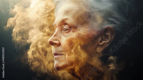 Portrait of an elderly woman with closed eyes surrounded by swirling golden and gray smoke evoking a sense of contemplation and mystery