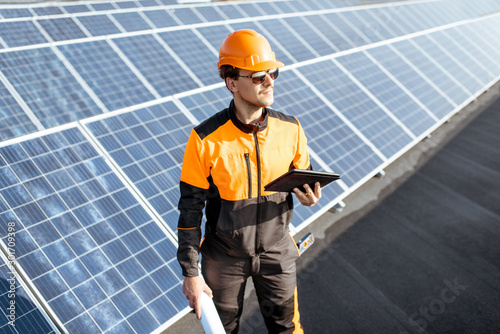 Portrait of an engineer in protective workwear carrying out service of solar panels with digital tablet and blueprintson a photovoltaic rooftop plant