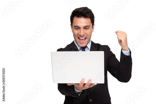 Portrait of an excited Businessman holding laptop computer and celebrating success over white background, Raising arms with a look of happiness, Male model