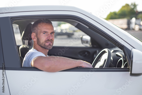 Portrait of an handsome guy driving his car. Driver.