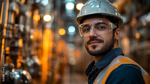 Portrait of an industrial worker wearing safety gear. He's in a factory setting, looking confidently at the camera. Safety is key.