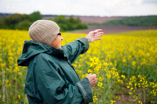 Portrait of an old woman in a rapeseed field. Happy old woman walking in a field of blooming rapeseed. The concept of rest, relaxation, happiness.