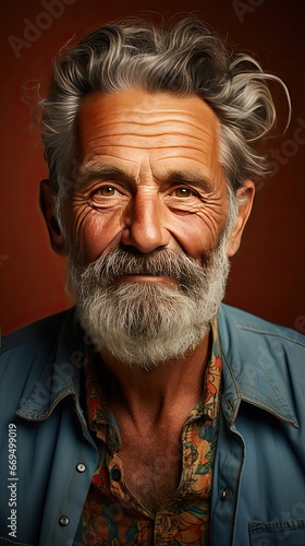 Portrait of an older man wearing a shirt on background. A happy old man looks at a camera over a gray wall. Man portrait illustration. Generative AI