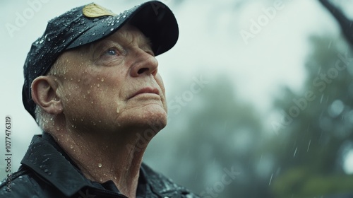 Portrait of an older man with raindrops on his face, gazing thoughtfully upward amidst a rainy day backdrop.