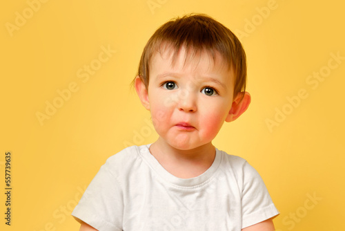 Portrait of an upset toddler baby with a surprised sad face on a studio yellow background. Offended child with disheveled hair in a white t-shirt. Kid aged one year and four months