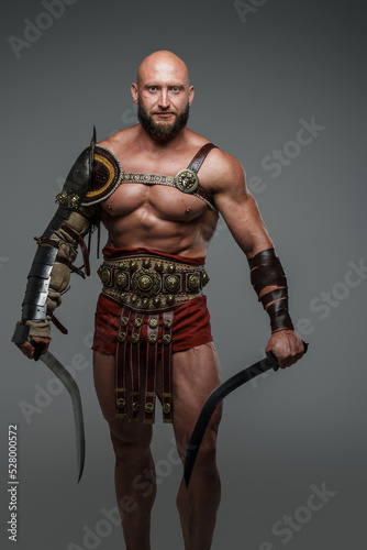 Portrait of ancient gladiator dressed in armour holding swords isolated on gray.