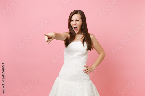 Portrait of angry irritated bride woman in white wedding dress swearing screaming pointing index finger aside isolated on pink background. Wedding celebration concept. Copy space for advertisement.