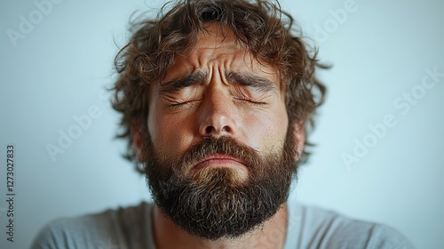 portrait of annoyed tired bearded caucasian man facepalm feel fatigue and burnout after working late night sighing close eyes bothered feel uneasy and depressed standing white wall background