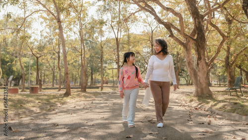 Portrait of asia grandmother and grandchildren holiday vacation together in the park in the summer in Southeast Asia Pacific. Walking