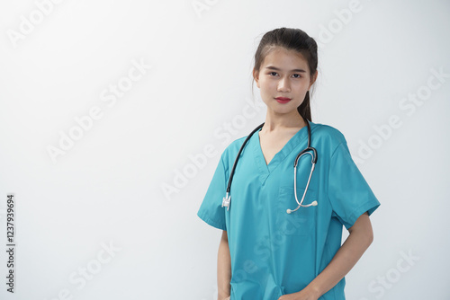 Portrait of Asian doctor woman standing both hands in pocket in white studio background