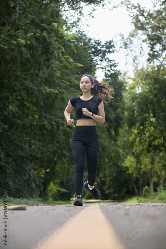 Portrait of Asian female runner jogging on street because jogging is a good exercise for good health. Beautiful Asian female runner is jogging on the street alone in morning for good health exercise.