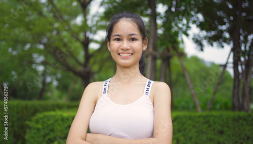 Portrait of Asian woman girl in yoga class club doing exercise, runing or jogging at public garden park. Outdoor sport and recreation. People lifestyle activity with nature trees view.