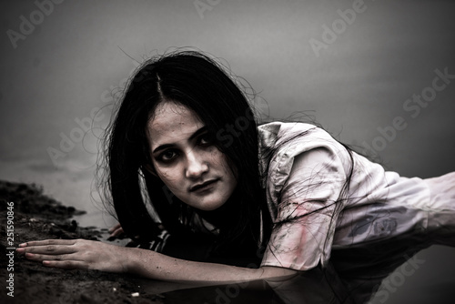 Portrait of asian woman make up ghost face at the swamp,Horror scene,Scary background,Halloween poster,Thailand people