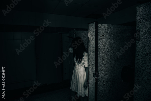 Portrait of asian woman make up ghost face with blood,Horror scene,Scary background,Halloween poster,Thailand people