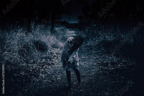 Portrait of asian woman make up ghost face with blood,Horror scene,Scary background,Halloween poster,Thailand people,Ghost movies poster