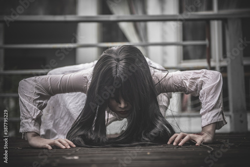 Portrait of asian woman make up ghost,Scary horror scene for background,Halloween festival concept,Ghost movies poster