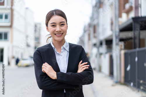 Portrait of Asian young businesswoman stand outdoor and crossing arm.