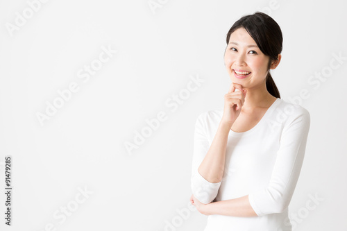 portrait of attractive asian woman thinking on white background