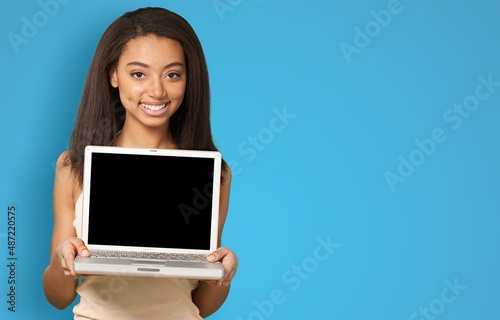 Portrait of attractive cheerful skilled girl using laptop on a background