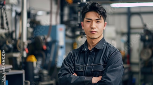 Portrait of Attractive confident Asian male auto mechanic working in Car Service. copy space for text.
