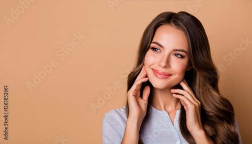 Portrait of attractive dreamy girl touching smooth clean clear soft skin isolated over beige backgorund