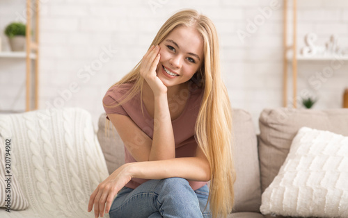Portrait of attractive girl sitting on couch and smiling
