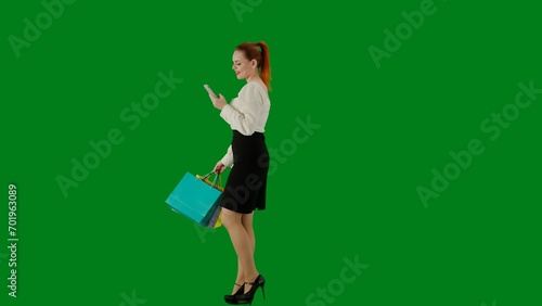 Portrait of attractive office girl on chroma key green screen. Woman in skirt walking holding gift bags and texting on smartphone. Side view.