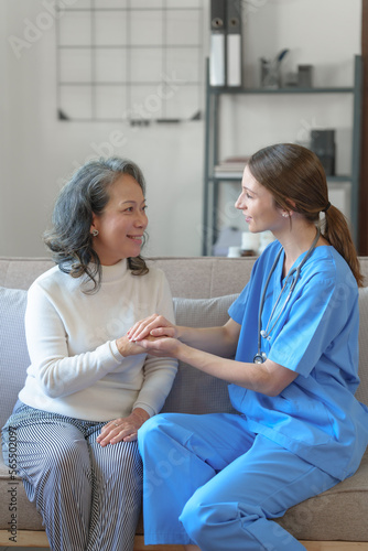 Portrait of attractive young caucasian female nurse elderly caregivers with senior patient home caring for elderly asia female patients on couch, indoors. hand clasp to encourage