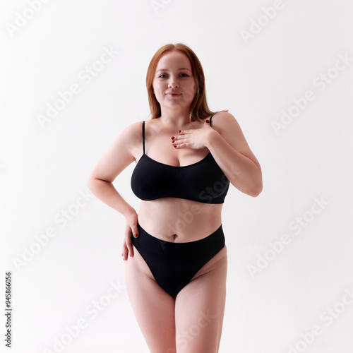 Portrait of attractive young girl with chubby, overweight body, posing in black underwear, showing confidence, isolated on white studio background. Natural beauty, body positivity, acceptance concept