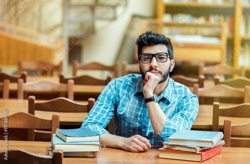 Portrait of bearded student wears glassses thinking at the table with books in the library reading hall