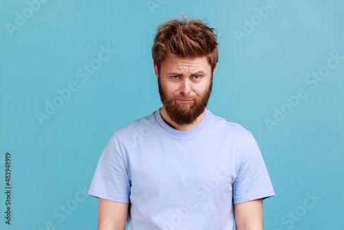Portrait of bearded upset young man standing and looking at camera with dissatisfied sadness face, expressing sorrow, having bad mood. Indoor studio shot isolated on blue background.