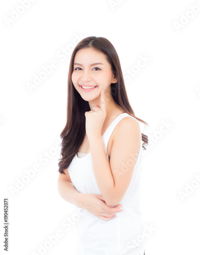Portrait of beautiful asian woman makeup of cosmetic, girl hand touch cheek and smile attractive, face of beauty perfect with wellness isolated on white background with skin healthcare concept.