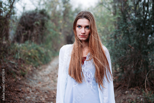 Portrait of beautiful blue eyed girl in white nightgown, looking like a fairy.