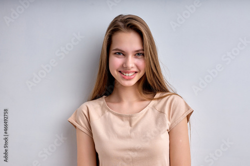 Portrait of beautiful caucasian teenage girl isolated on white background, smiling happily, in casual wear, enjoying life, in good mood, posing at camera, having natural long hair and big lips.
