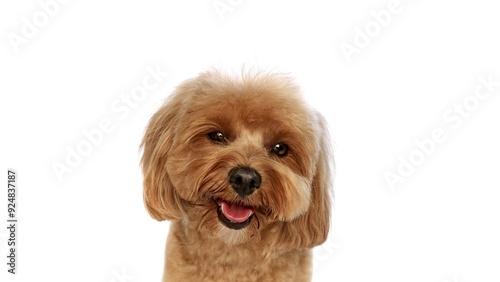 Portrait of beautiful fluffy dog, adorable purebred Poodle smiling isolated on white background. Concept of animals, domestic pet, care, vet, joy and fun, pet friend. Copy space for ad
