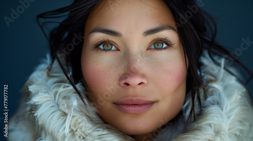 Portrait of beautiful indigenous woman wearing traditional fur coat.