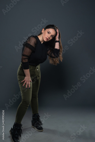 Portrait of beautiful model in black dress, hat and sunglasses on gray background